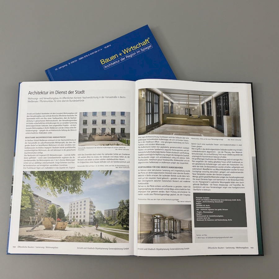 Wir freuen uns, dass zwei unserer Projekte in Bauen und Wirtschaft Berlin 2025 vorgestellt werden: der kommunale Wohnungsbau Hansastraße und der Pfortenumbau einer obersten Behörde.