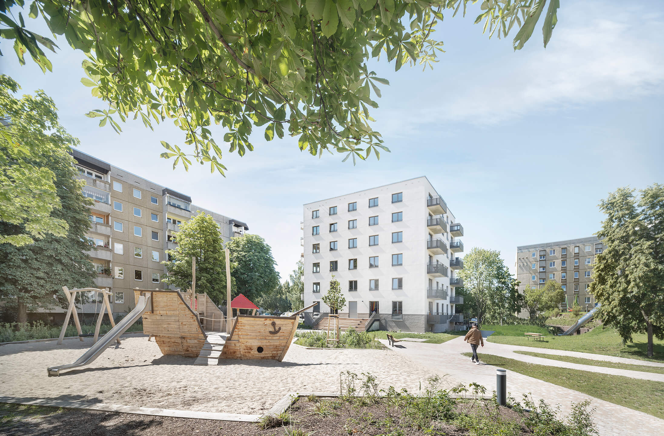 Neubau von vier Wohngebäuden im Berliner Bezirk Pankow, Ortsteil Weißensee. Es entstehen insgesamt 85 neue Wohnungen und zwei Gewerbeeinheiten sowie neue Spielplätze und individuelle Grünflächen. Drei der neuen Punkthäuser fügen sich in das bestehende Quartier ein, das vierte Punkthaus wird am Orankesee errichtet.