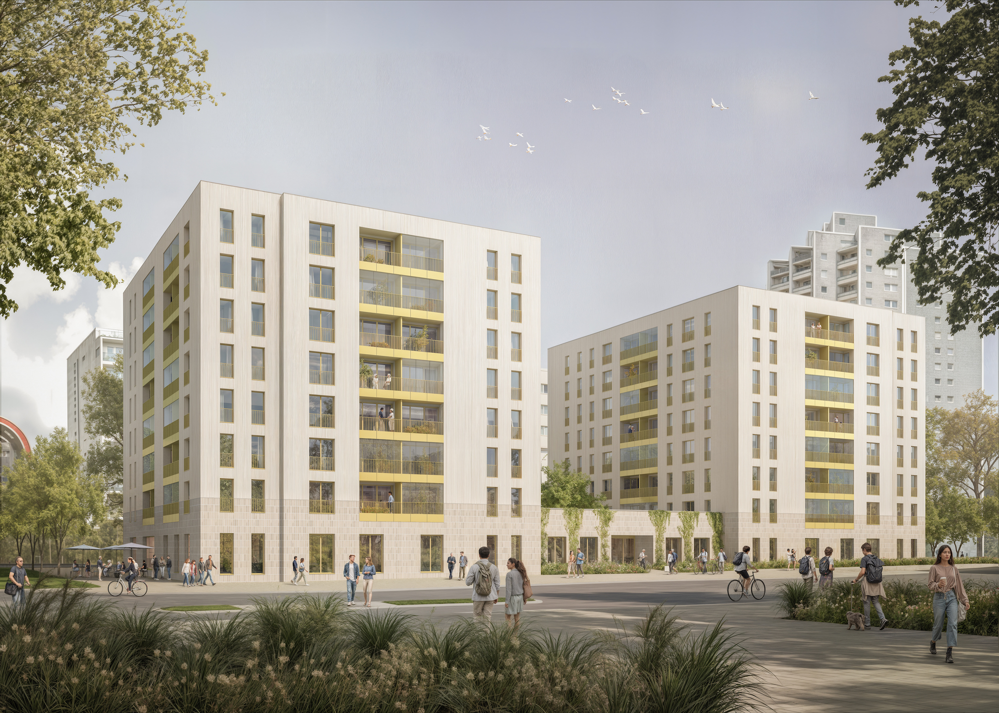 Neubau einer Wohnanlage mit 140 Wohneinheiten und 3 Gewerbeeinheiten. Das unterkellerte Ensemble umfasst zwei achtgeschossige Wohntürme, die im Erdgeschoss durch einen eingeschossigen Baukörper verbunden sind. Die beiden Wohntürme heben sich klar vom Gebäudesockel ab: Während der Sockel mit einer Fassade aus Klinkerriemchen im stehenden Langformat gestaltet ist, erhalten die Regelgeschosse der Türme eine vertikale Struktur in Form eines hellen Kammputzes. Subtile Vor- und Rücksprünge gliedern die Fassade zusätzlich.