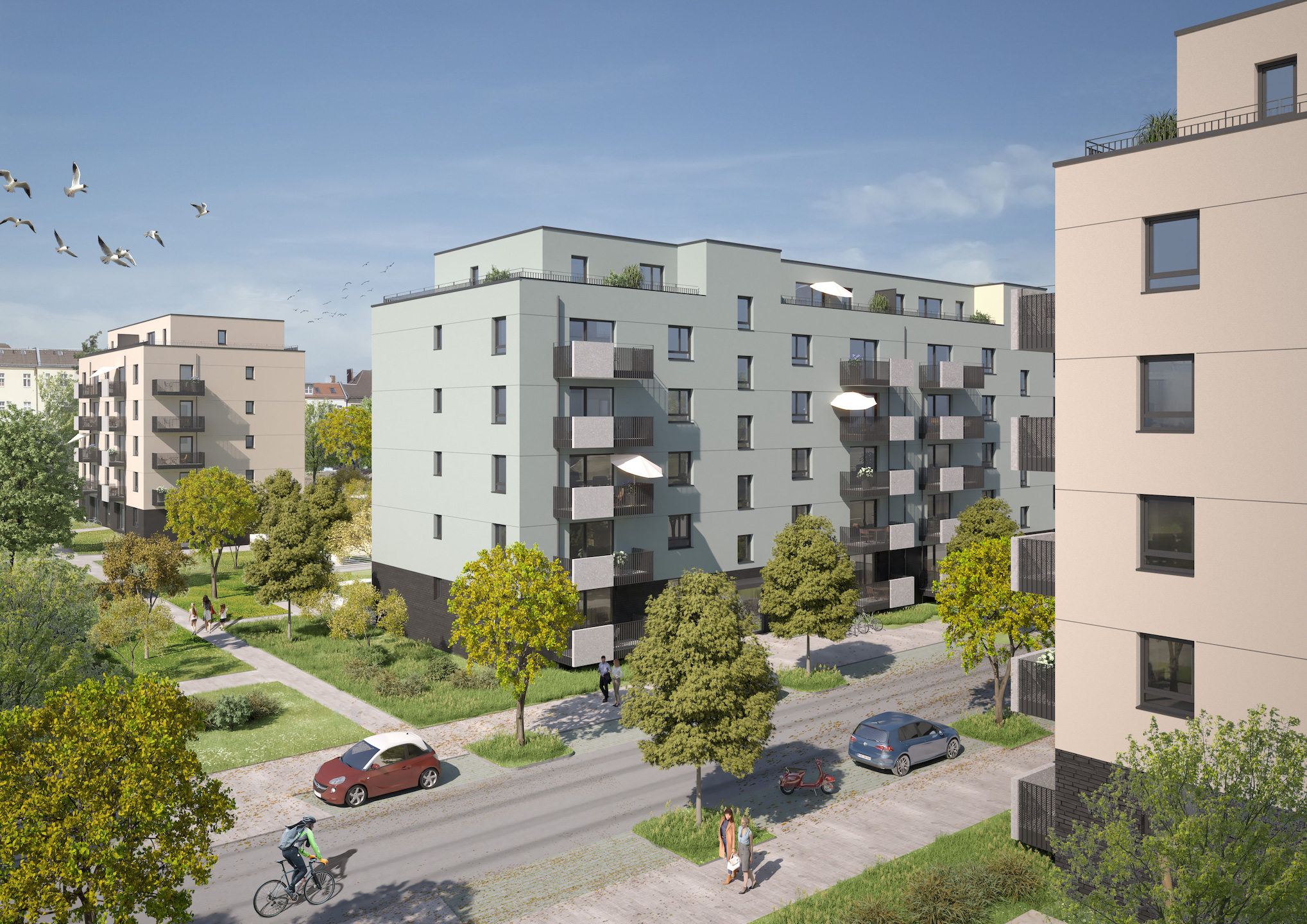 Wohnungen mit ein bis vier Zimmern bieten Angebote für unterschiedliche Lebensmodelle. Balkone und Terrassen erweitern den Wohnraum nach außen. Begrünte Freiflächen und Spielbereiche fördern Begegnung. Extensive Dachbegrünung, Photovoltaik, Regenwasserversickerung und der energetische Standard KfW-Effizienzhaus 55 unterstützen ein ressourcenschonendes Quartier. Zwei Tiefgaragen mit insgesamt 164 Stellplätzen ergänzen die kompakte Bauweise.