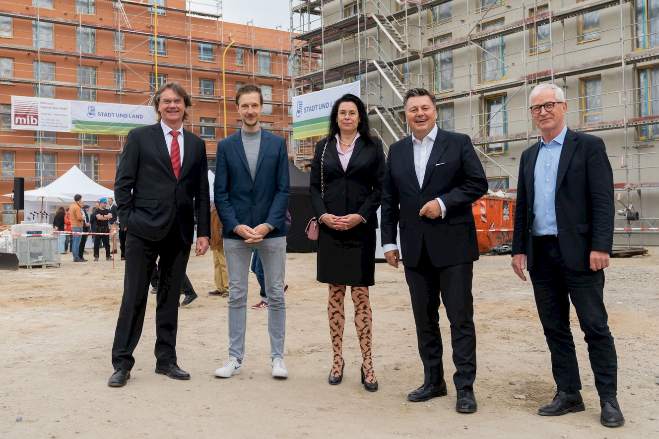 Ingo Malter (STADT UND LAND), Gordon Lemm, Natascha Klimek (STADT UND LAND), Andreas Geisel und Dr. Christoph Landerer, Aufsichtsratsvorsitzender der STADT UND LAND, auf der Baustelle an der Gothaer Straße.
