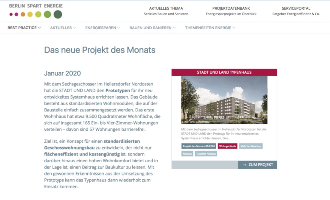 Das Energiewende-Portal „Berlin spart Energie“ kürt das Stadt und Land Typenhaus zum Projekt des Monats.
