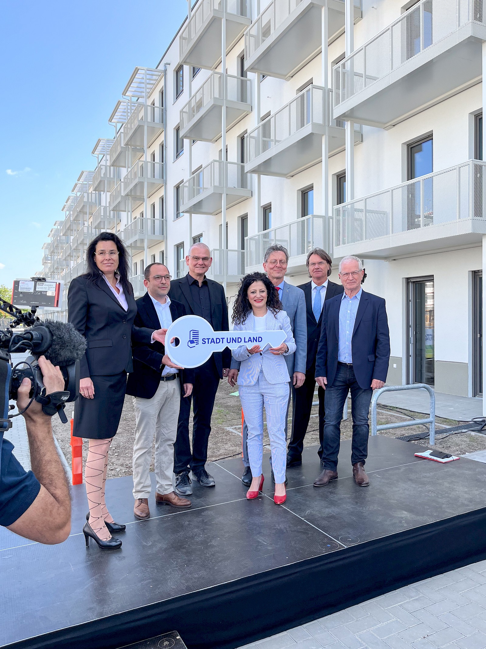 Arnold und Gladisch feierten in der vergangenen Woche gemeinsam mit der Bauherrin STADT UND LAND und in Anwesenheit von Cansel Kiziltepe, Senatorin für Arbeit, Soziales, Gleichstellung, Integration, Vielfalt und Antidiskriminierung, sowie von Christian Gaebler, Senator für Stadtentwicklung, Bauen und Wohnen, die Schlüsselübergabe von 105 neuen Wohnungen am Hassoweg/Nelkenweg in Berlin-Altglienicke an das Landesamt für Flüchtlingsangelegenheiten (LAF).