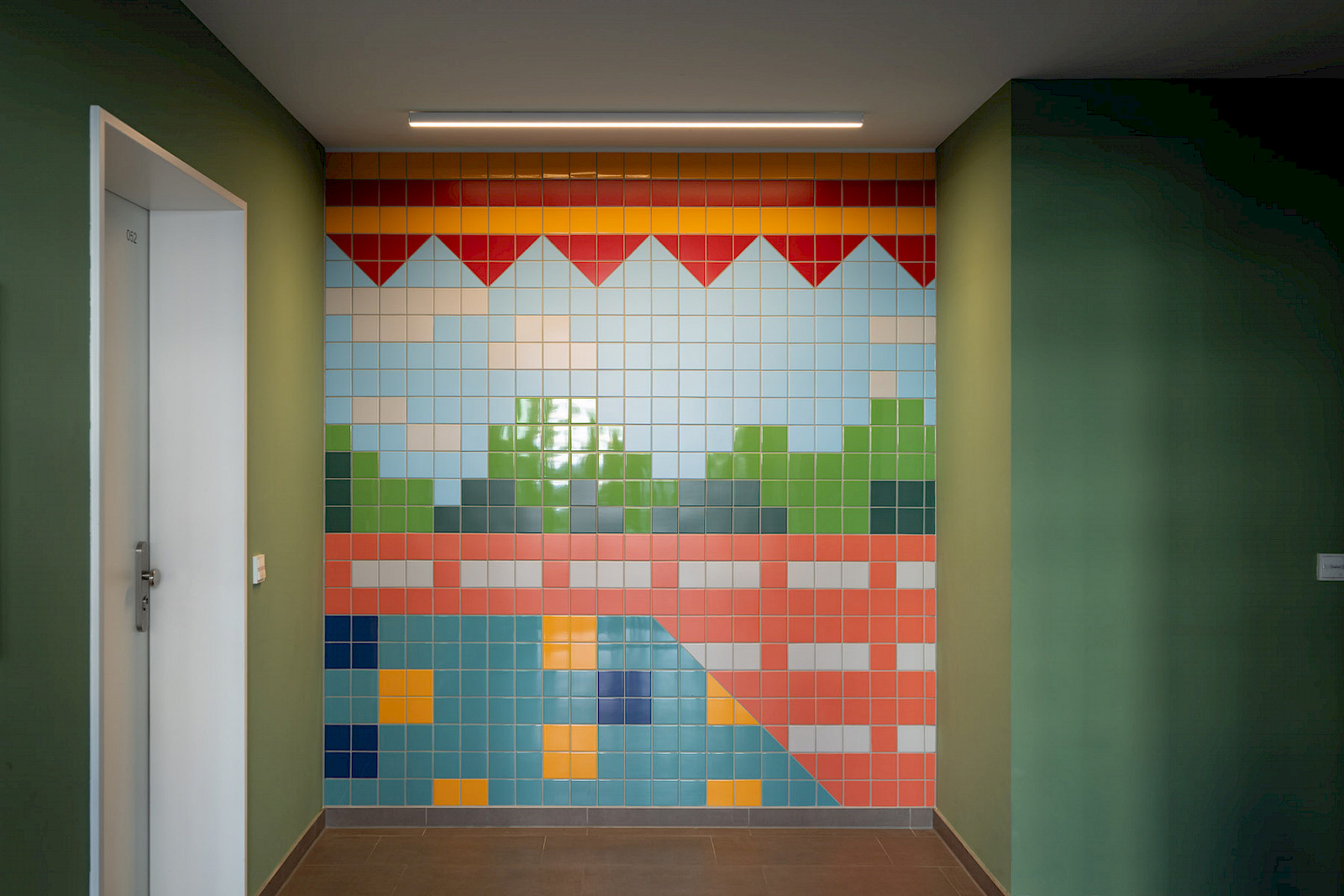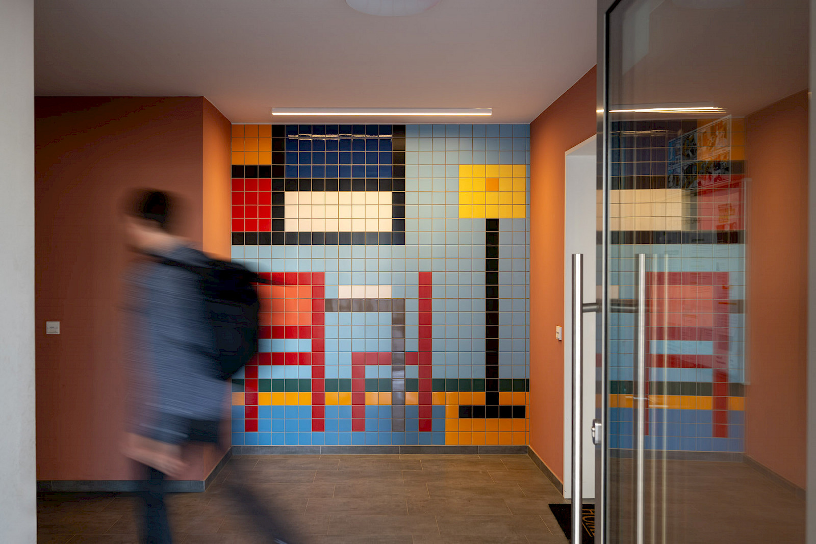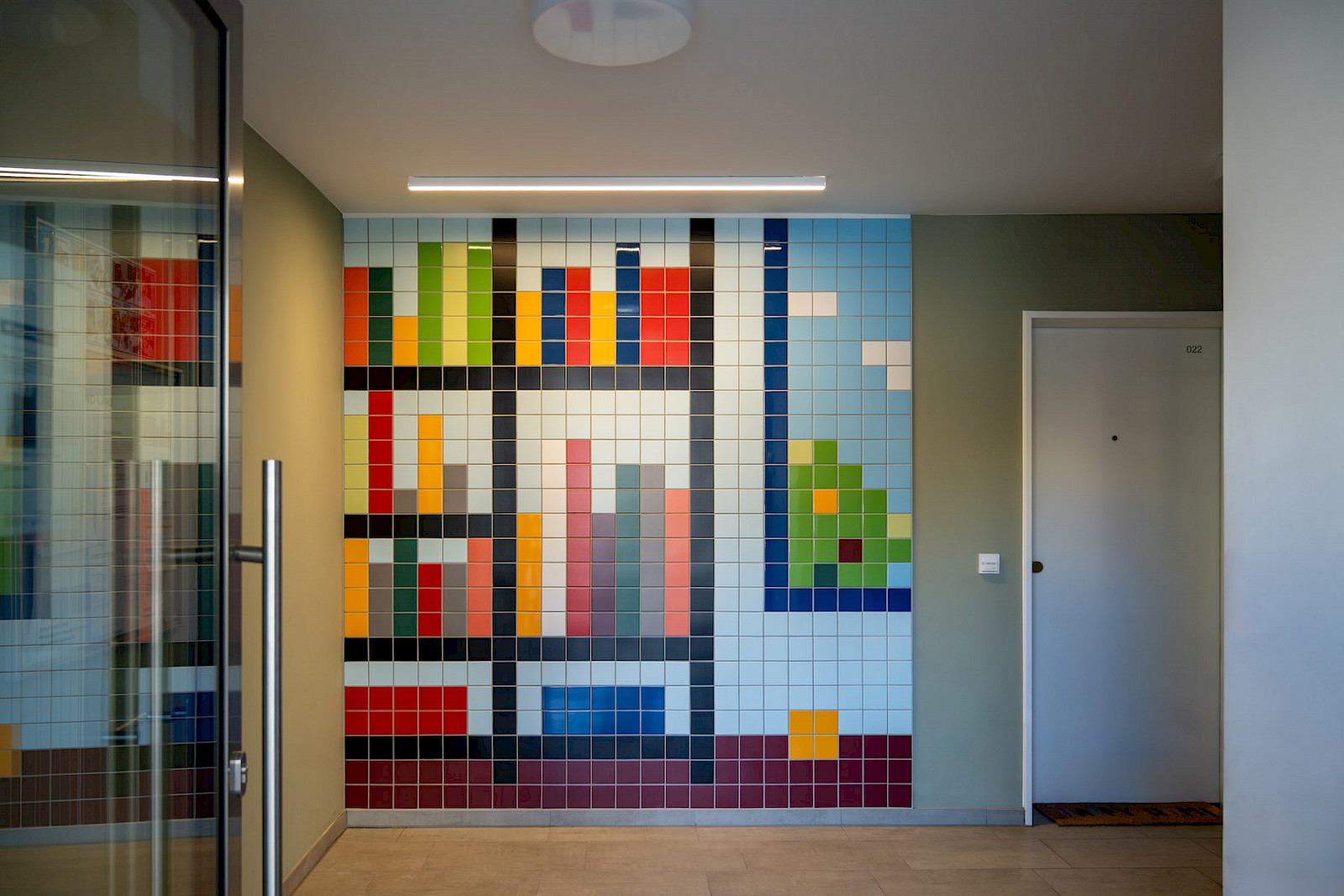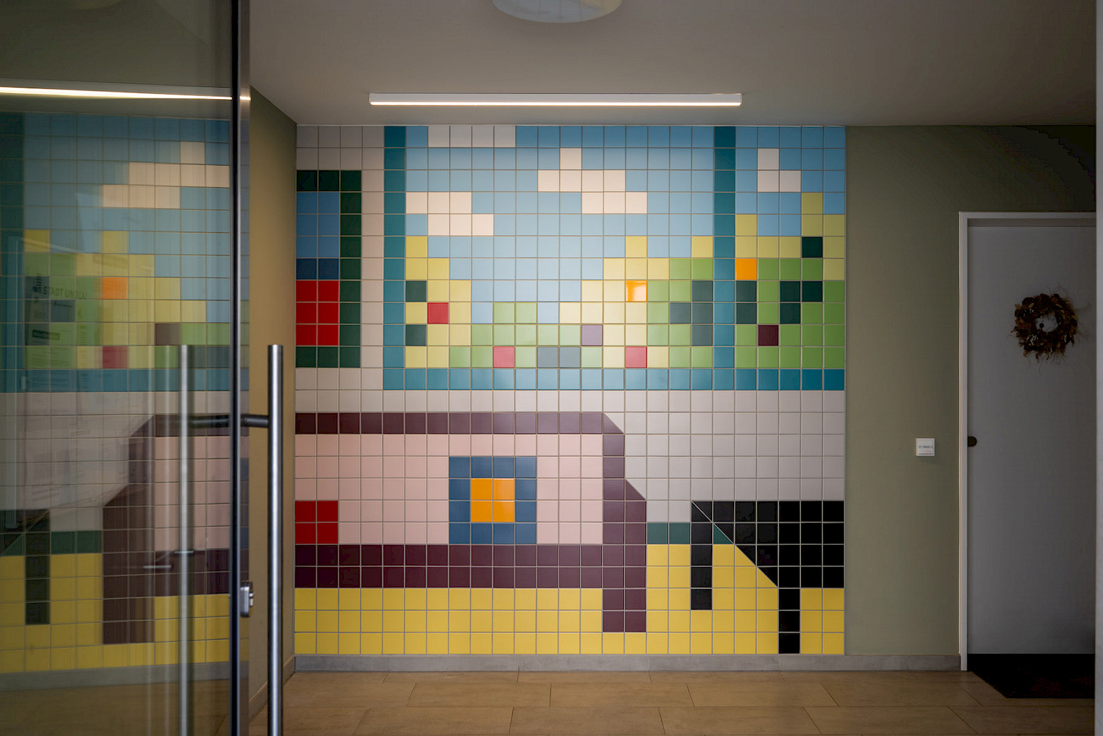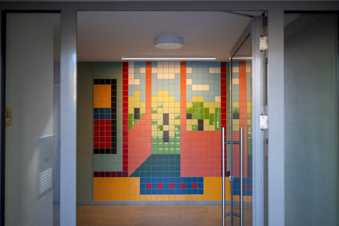 Jedes Werk des prämierten Entwurfs „Hereinspaziert!“ besteht aus rund 600 farbigen Fliesen, misst etwa 2,5 x 2,4 Meter und bringt Farbe, Charakter und künstlerische Haltung in die Foyers unseres Neubauensembles. Die Motive gewähren einen Einblick in unterschiedliche Wohn-Szenerien.