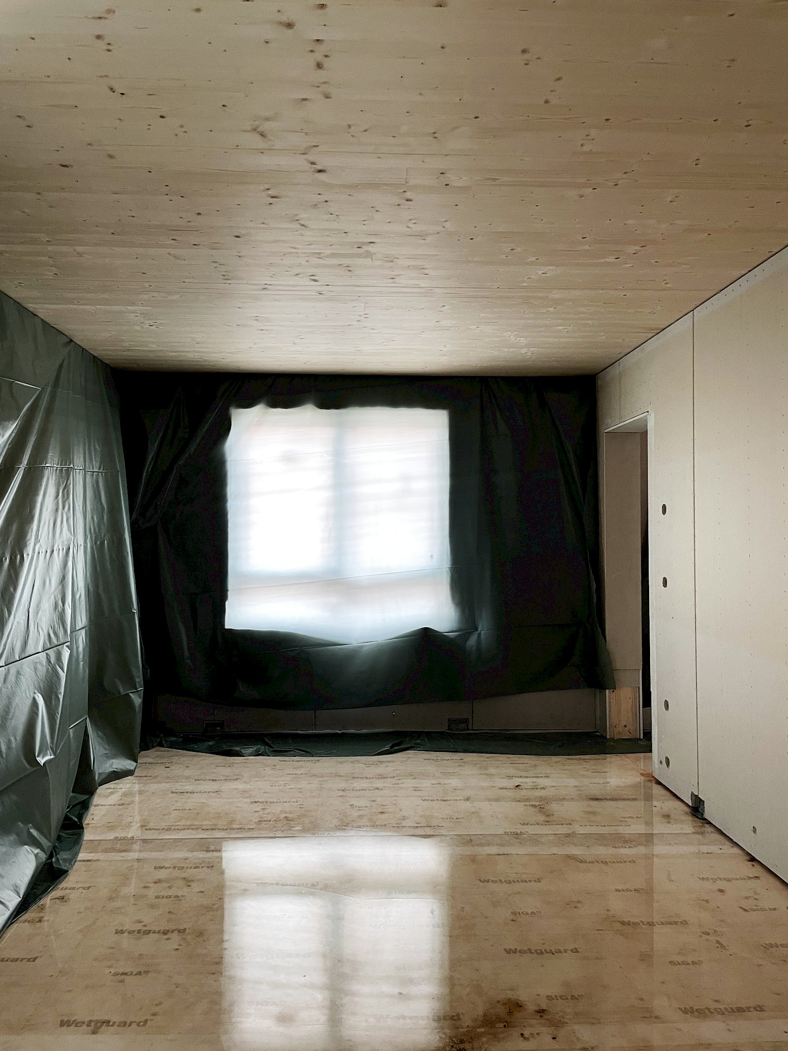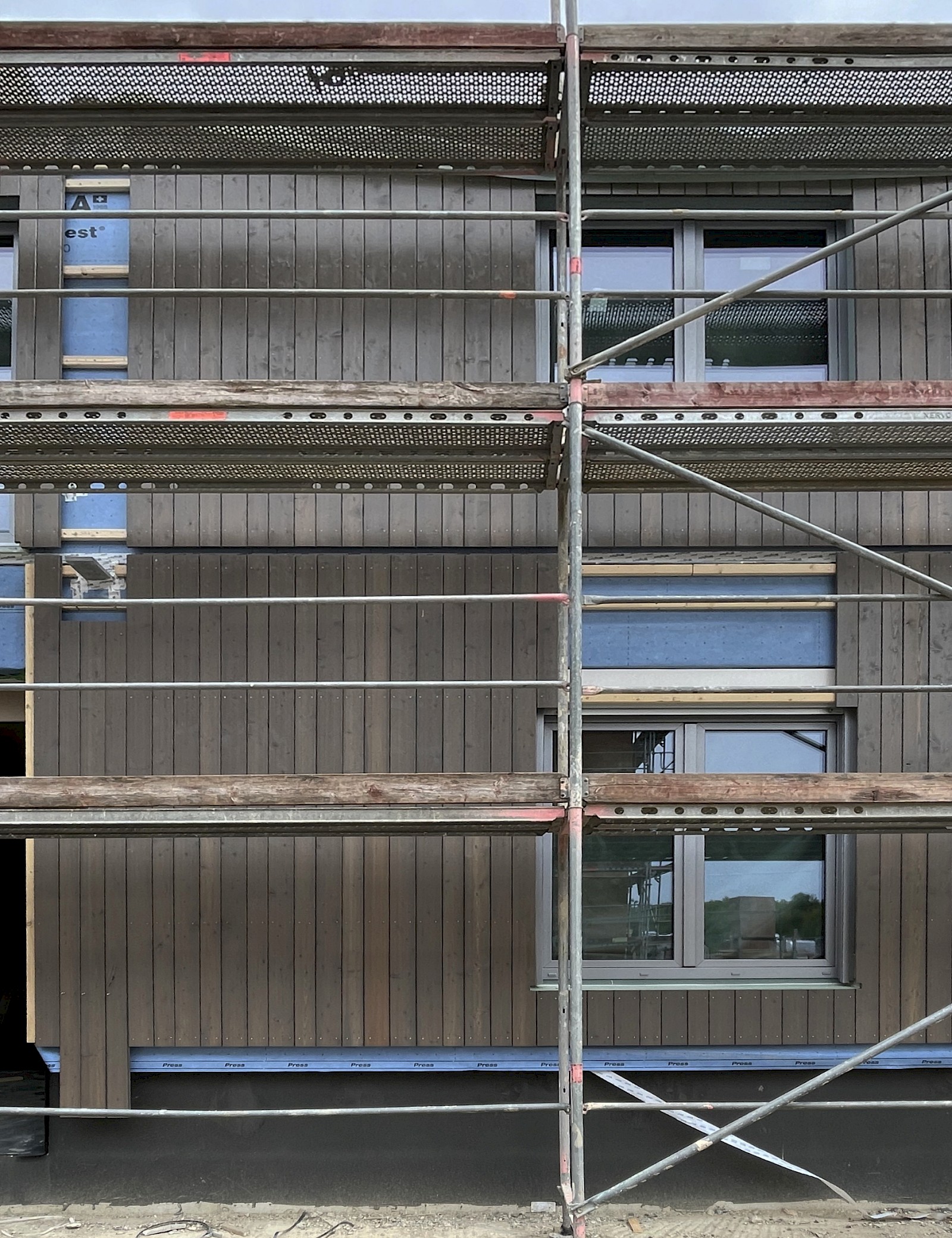 Auf der Baustelle des STADT UND LAND TYPENHAUSeco wird der Betonkern inzwischen von zwei Geschossen in Holzbau umrahmt. Auch ein Teil der Holzaußenwandverkleidung in Lärche ist bereits montiert.