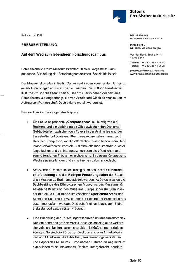 Auf dem Weg zum lebendigen Forschungscampus: Bei einer Pressekonferenz am 4. Juli werden die Ergebnisse der Potenzialanalyse von Arnold und Glastisch Architekten zum Museumsstandort Dahlem vorgestellt.