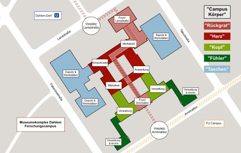 Lebendiger Campus-Körper: Der Campus-Körper wird mit seinen zwei Haupteingängen zwischen den Vorplätzen Arnimallee und Lansstraße aufgespannt. Aus der Vogelperspektive lässt er sich - wie ein präpariertes Insekt - als Organismus mit Kopf, Rückgrat, Herz, Fühlern und Taschen deuten. Der Grundgedanke dieser in der Potenzialstudie vorgestellten Positionierung der Funktionen ist, eine logische Abfolge und Zusammenfassung der einzelnen Aufgabenbereiche zu erreichen. [Bild 3]