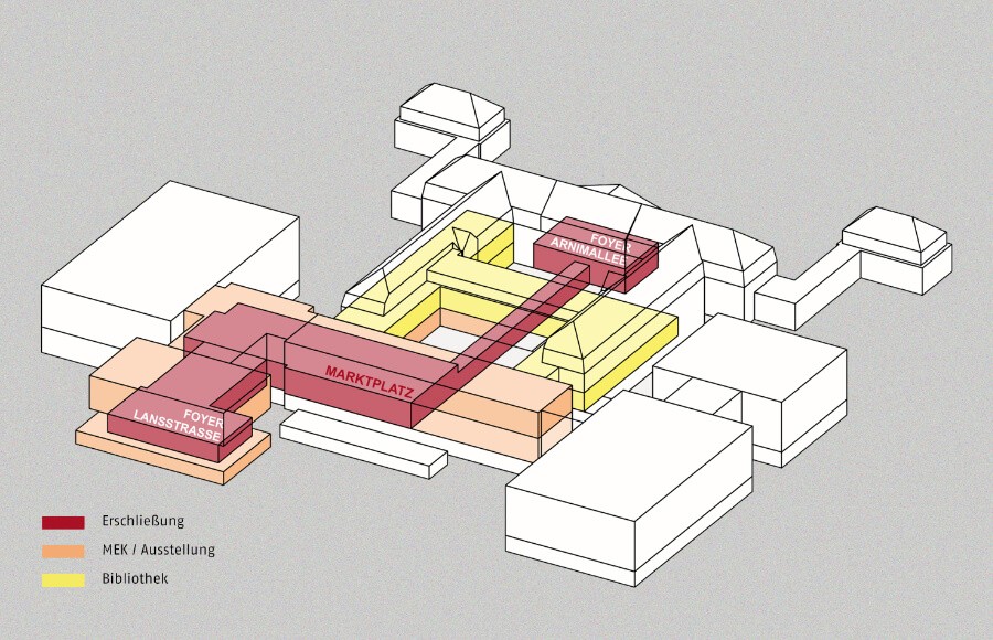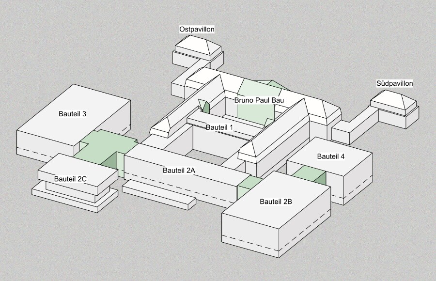 Der Museumskomplex Dahlem besteht aus mehreren Baukörpern: Der Bruno-Paul-Bau wurde 1914-1921 an der Arnimallee errichtet. Es folgte der 1964 bis 1965 nach dem Entwurf von Bruno Grimmek und Beteiligung von Wils Ebert errichtete Bauteil (hier: Bauteil 1). Der dritte Bauabschnitt wurde 1965 bis 1973 nach Plänen von Wils Ebert und Fritz Bornemann errichtet. Die verschiedenen Gebäudeteile sind miteinander verbunden, wodurch sich „Gelenke“ (hier grün) als Erschließungskerne identifizieren lassen, z. B. die beiden Foyers in der Arnimallee und der Lansstraße. [Bild 2]