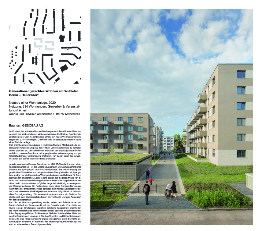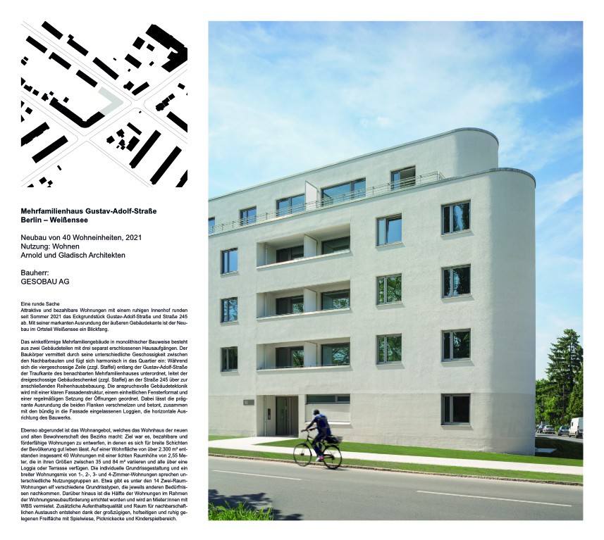 Arnold und Gladisch Architekten sind in diesem Jahr mit den beiden Projekten Wohnquartier Lion-Feuchtwanger-Straße (in Arge mit DMSW) und Mehrfamilienhaus Gustav-Adolf-Straße vertreten.