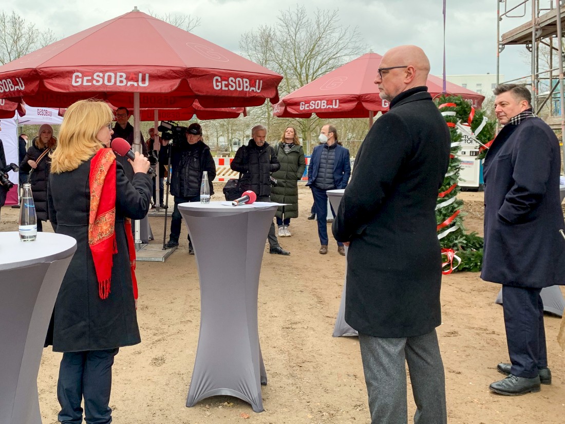 Im Beisein von Stadtentwicklungssenator Andreas Geisel, Bezirksbürgermeister von Marzahn-Hellersdorf Gordon Lemm, Bezirksstadträtin Juliane Witt und Geschäftsführer von Arnold und Gladisch, Frank Arnold, beging das landeseigene Wohnungsunternehmen GESOBAU AG am 9. Februar 2022 das Richtfest im Bauvorhaben Kastanienallee im Quartier Stadtgut Hellersdorf.