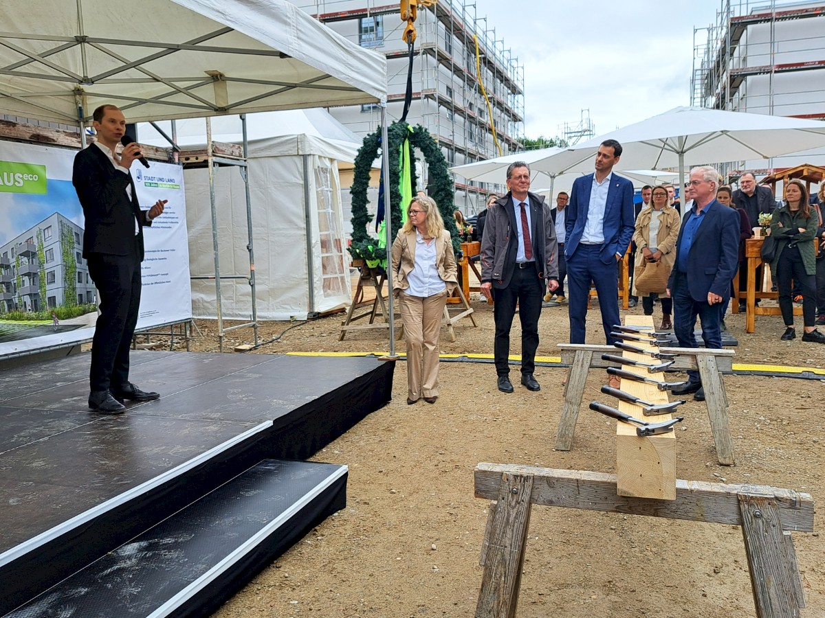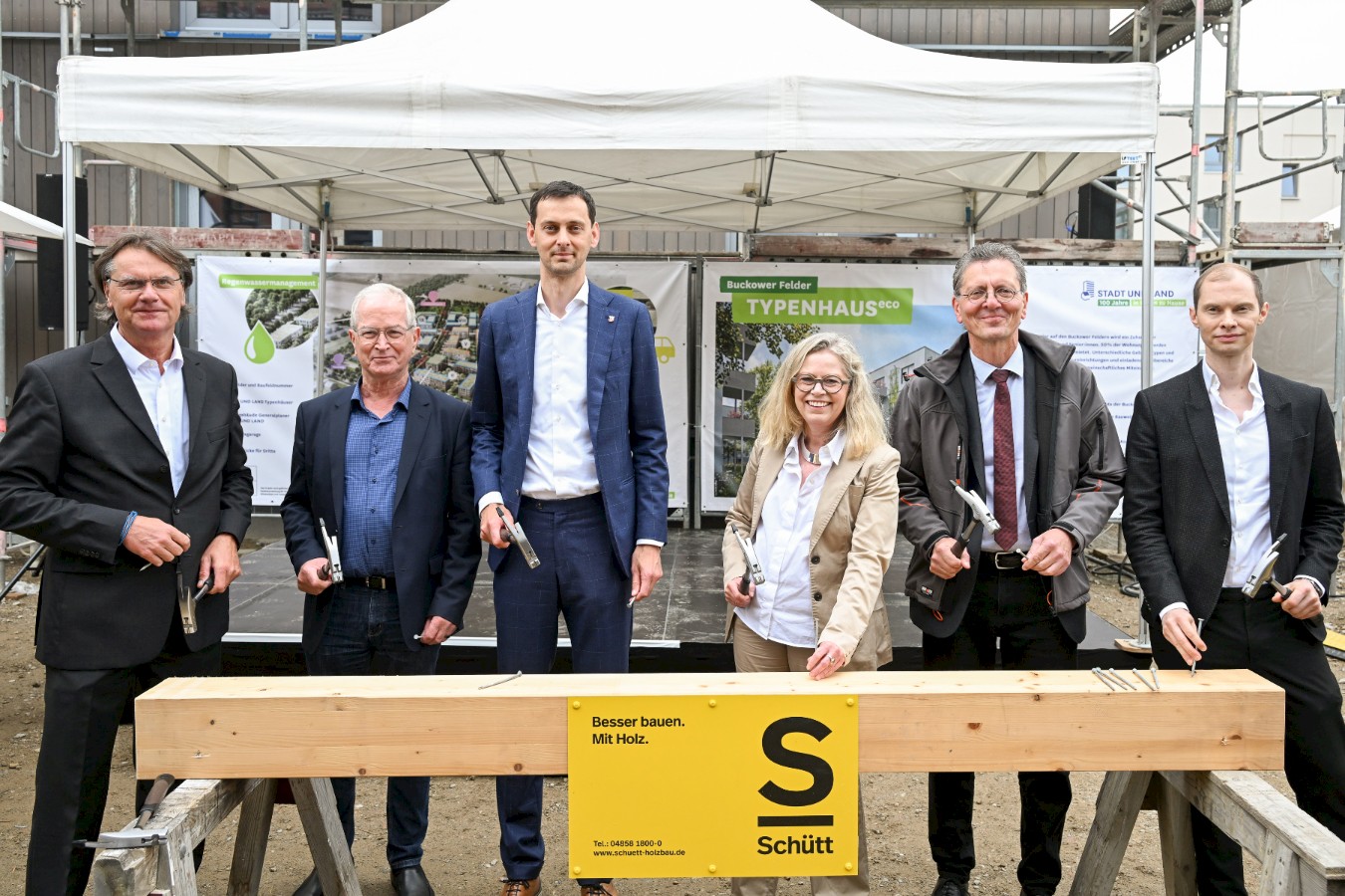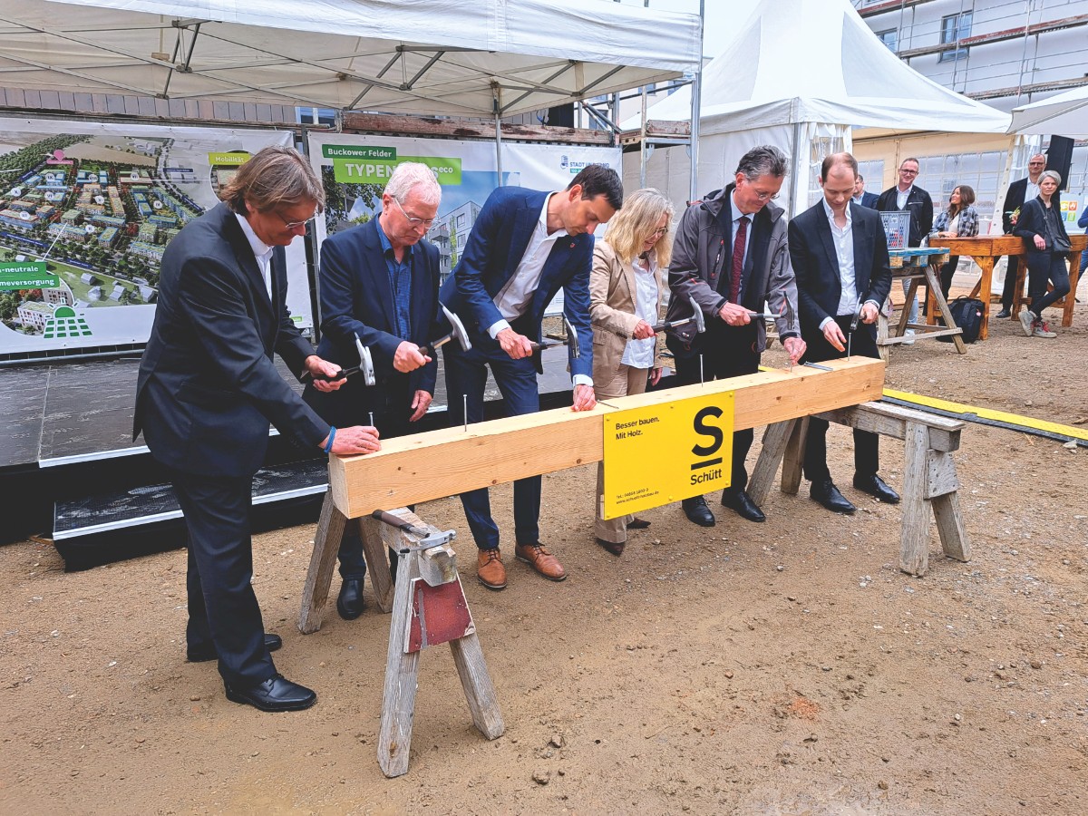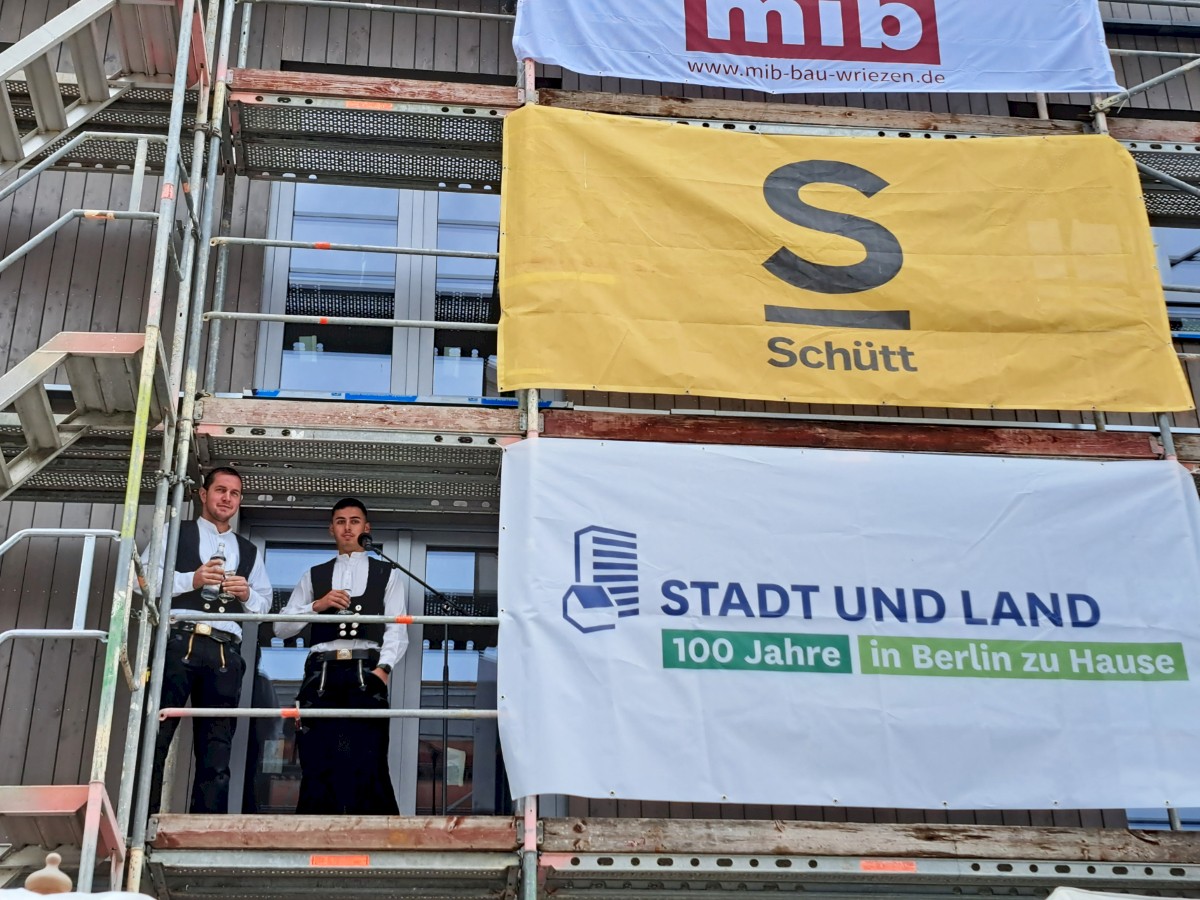 Die Begrüßung zu den Feierlichkeiten auf der Baustelle eröffnete Ingo Malter, Geschäftsführer der STADT UND LAND, gefolgt von Grußworten von der designierten Senatorin für Mobilität, Verkehr, Klimaschutz und Umwelt, Ute Bonde, dem Senator für Stadtentwicklung, Bauen und Wohnen, Christian Gaebler und dem Bezirksbürgermeister Neukölln, Martin Hikel sowie von feierlichen Worten zum Prototyp des TYPENHAUSeco von Axel Schmidt, Geschäftsführer von Arnold und Gladisch.