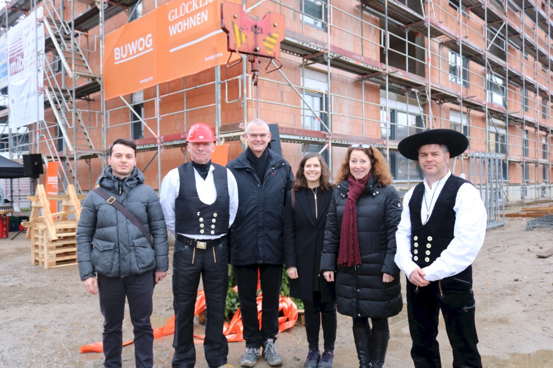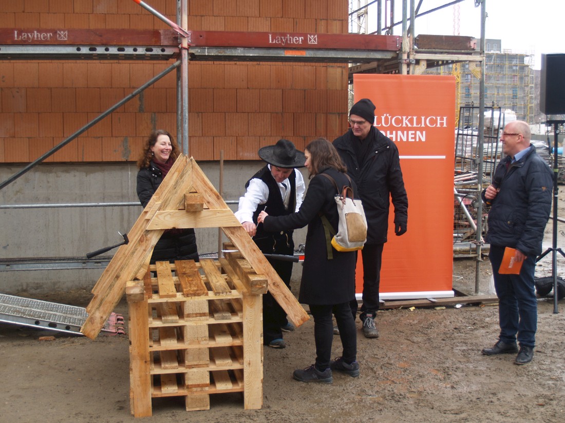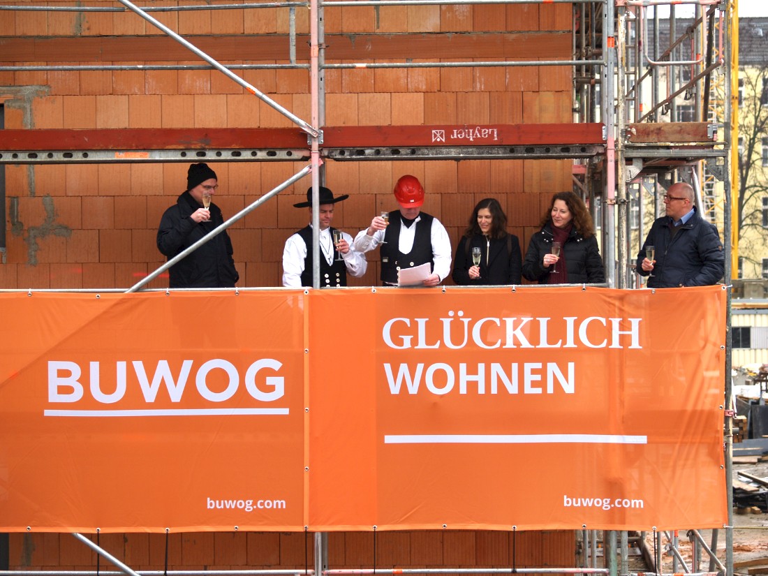 Mit einer Rede starteten Eva Weiß, Geschäftsführerin der BUWOG und Clara Benito Muro, Projektleiterin von Arnold und Gladisch Architekten die Feierlichkeiten auf der Baustelle der Fließstraße.