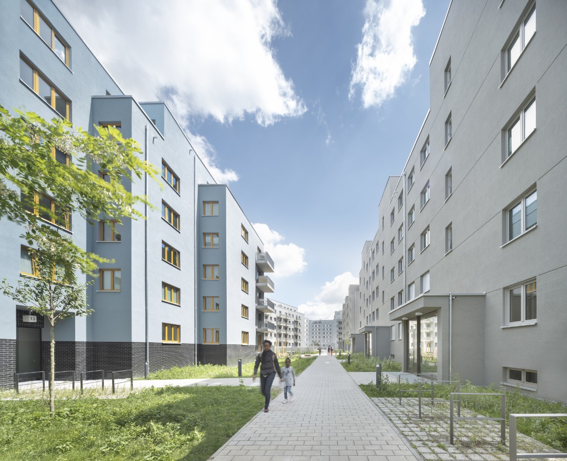 Mit dem Ziel einer sozialen Quartiersentwicklung entstand im »Stadtgut Hellersdorf« ein gemischtes Wohnquartier mit attraktivem und bezahlbarem Wohnraum sowie kulturellen und sozialen Angeboten im Auftrag der landeseigenen Wohnungsbaugesellschaft GESOBAU AG. Arnold und Gladisch haben in Arbeitsgemeinschaft mit DMSW Architekten zwei Quartiere mit über 1.000 Wohnungen an der Zossener Straße und der Kastanienallee realisiert. In der Ausstellung ist das Projekt Zossener Straße mit über 670 Mietwohnungen zu sehen.