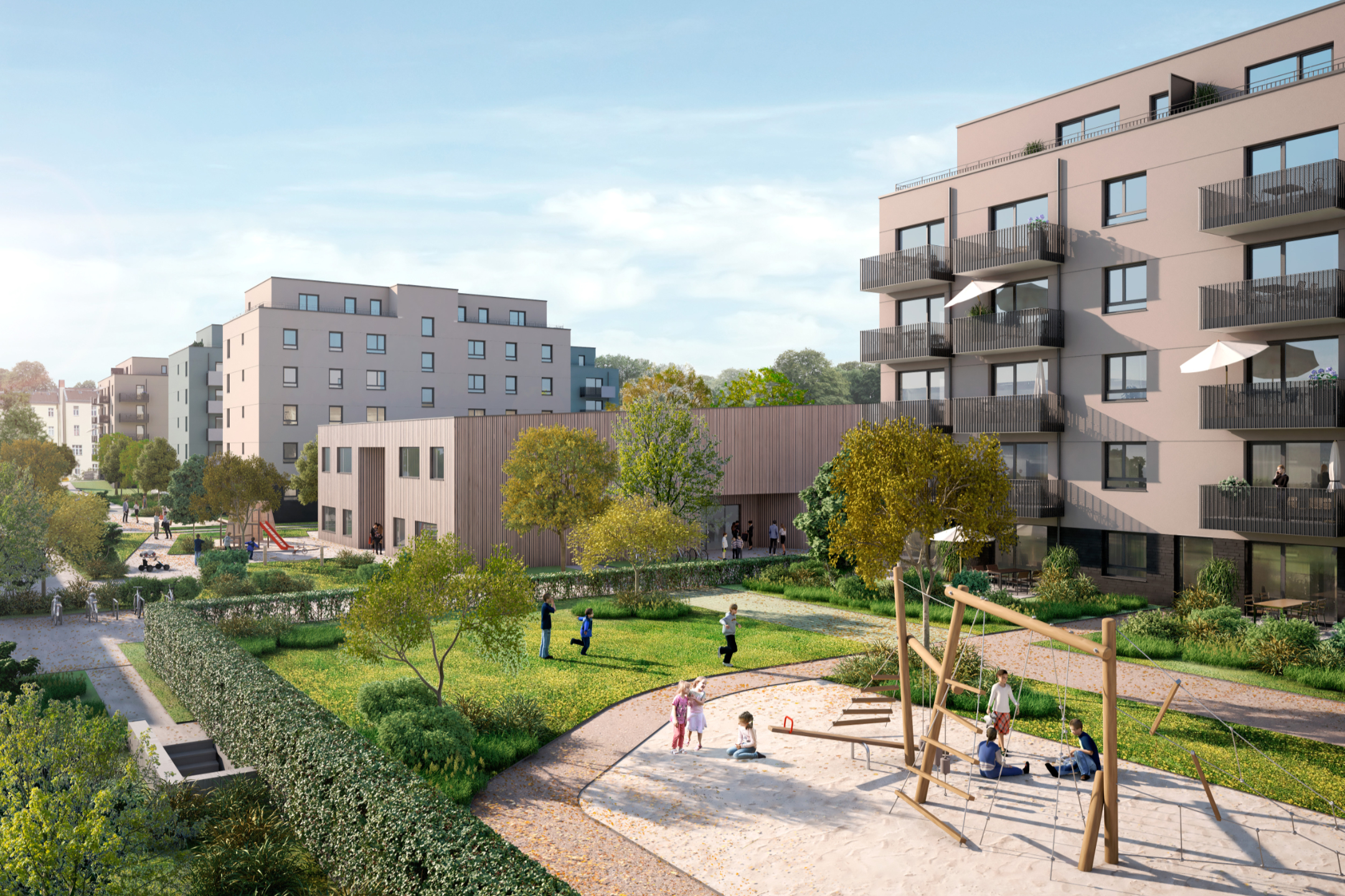 Neubau einer Holz-Kita für 90 Kinder im Spreequartier „Wohnwerk – Wohnen am Wasser“. Der zweigeschossige Baukörper zeichnet sich durch seine kompakte Gebäudekubatur mit eingerückten, wettergeschützten Ein- und Ausgängen aus und ist als Effizienzhaus mit Energiestandard Kfw-40-EE geplant. Um ökologische wie pädagogische Aspekte zu erfüllen, sind sowohl das äußere Erscheinungsbild – Holzfassade aus Lärche –, das Haupttragwerk – tragende Wände als Holztafelwände, Brettsperrholz-Elemente für Decken und das begrünte Pultdach – sowie der Innenraumausbau – helle Innenoberflächen aus Holz für das pädagogische Raumkonzept – in Holzbauweise konzipiert. Abgerundet wird die Aufenthaltsqualität durch emissionsarme und gesundheitsverträgliche Bodenbeläge aus Kautschuk. Das Atrium mit großzügigem Treppenhaus und Oberlicht bildet dabei den zentralen Verteiler und Spielfläche. Bei der Grundrissgestaltung ließ sich das Architekturbüro von der Idee leiten, eine lebendige und identitätsstiftende Raumlandschaft mit vielfältigen Orten und Ausprägungen zu kreieren, in und an der die Kinder wachsen können.