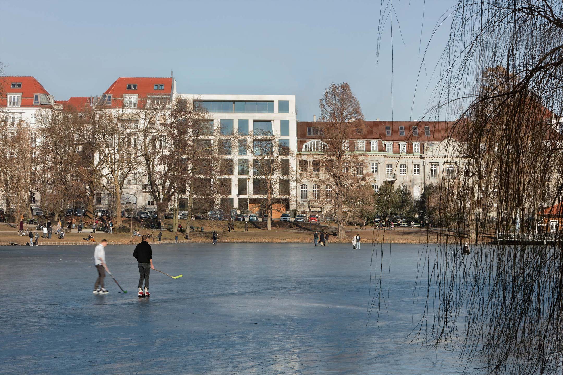 Neubau eines Wohngebäudes. 12 WE. 20 TG-Stellplätze. EnEV 2009. Urbane Lückenschließung mit Natursteinfassade am Lietzensee vermittelt zwischen ihren gründerzeitlichen Nachbarn. Großflächig verglast, öffnet sie sich mit ihren luftig-maritimen Loggien zum Wasser hin.