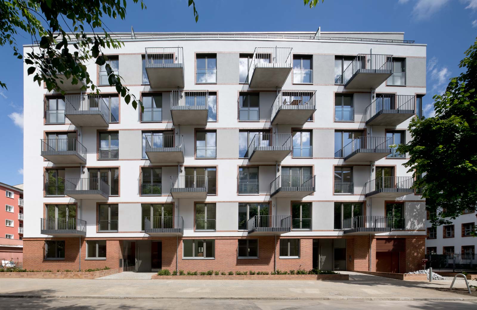 Neubau eines Wohngebäudes. 26 WE. 28 TG-Stellplätze. KfW 70. Ergänzung eines einst dreiteiligen denkmalgeschützten Ensembles nah am Lietzensee mit Bezügen zum benachbarten Postgebäude. Die lichten, individuell gestaltbaren Wohnungen orientieren sich zum umgebenden Grünraum und zum See.