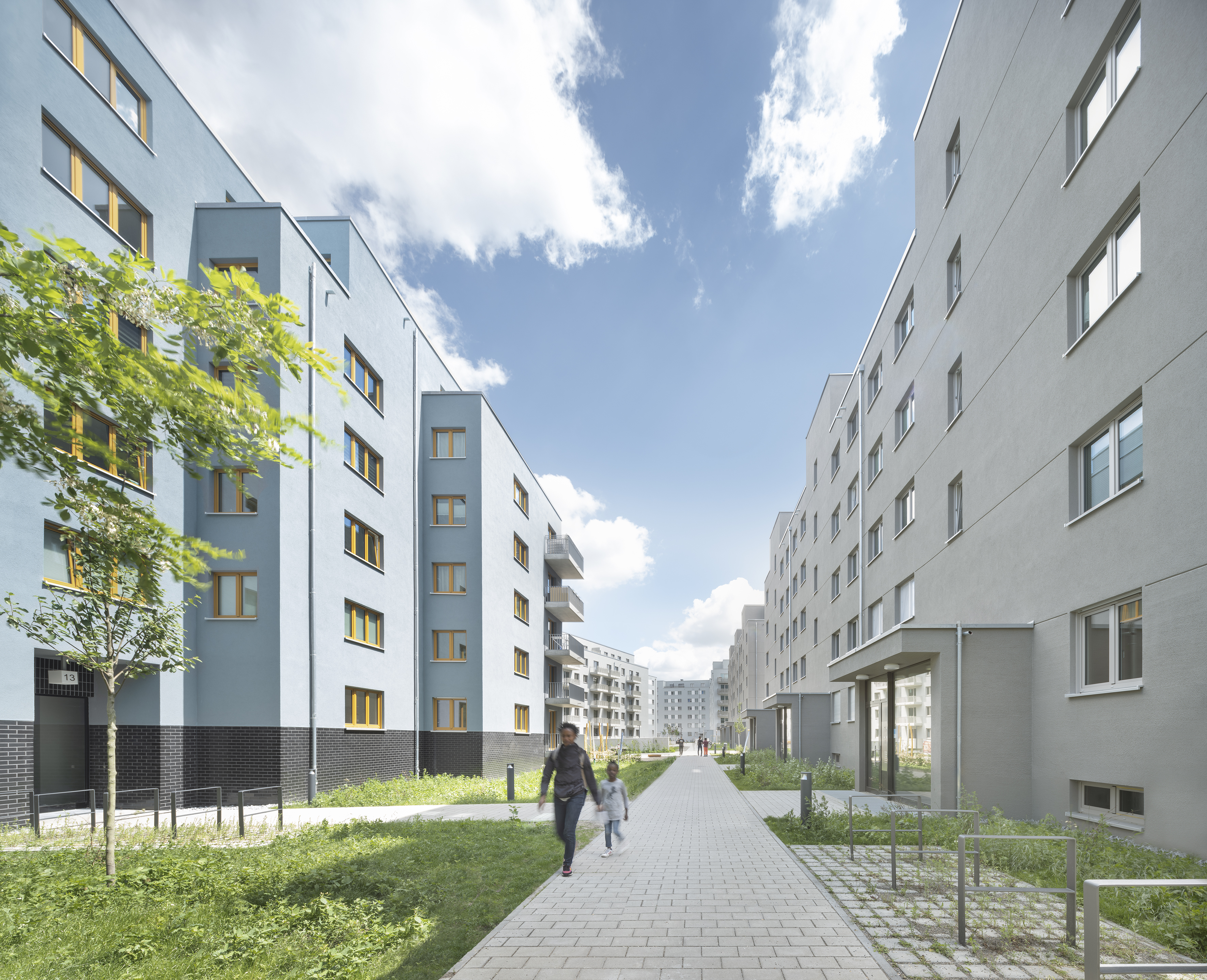 Neubau von zwölf Wohngebäuden. 187 Senioren- und 489 Standard-WE. EnEV Standard. Großzügig angelegte Grün- und Spielflächen, Einrichtungen für Senioren wie eine Kantine, Gemeinschafts- und Gewerbeflächen sowie ein Café am Park schaffen ein lebhaftes Quartier für Jung und Alt. Das ergänzende Parkhaus schafft etwa 500 PKW-Stellplätze und dient zusätzlich als Lärmbarriere zwischen Zossener Straße und Wohnbebauung.